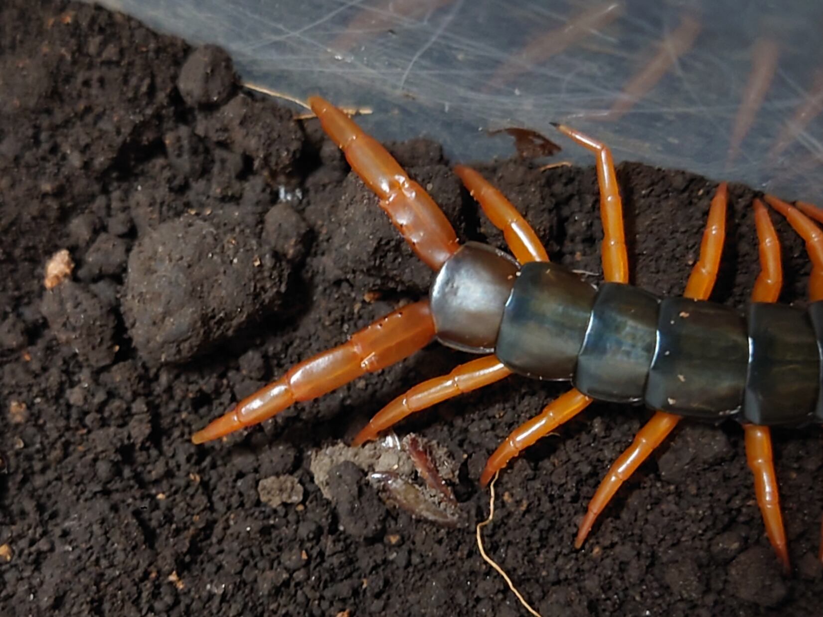 緑がかった暗い体にオレンジレッグの美しいムカデです。