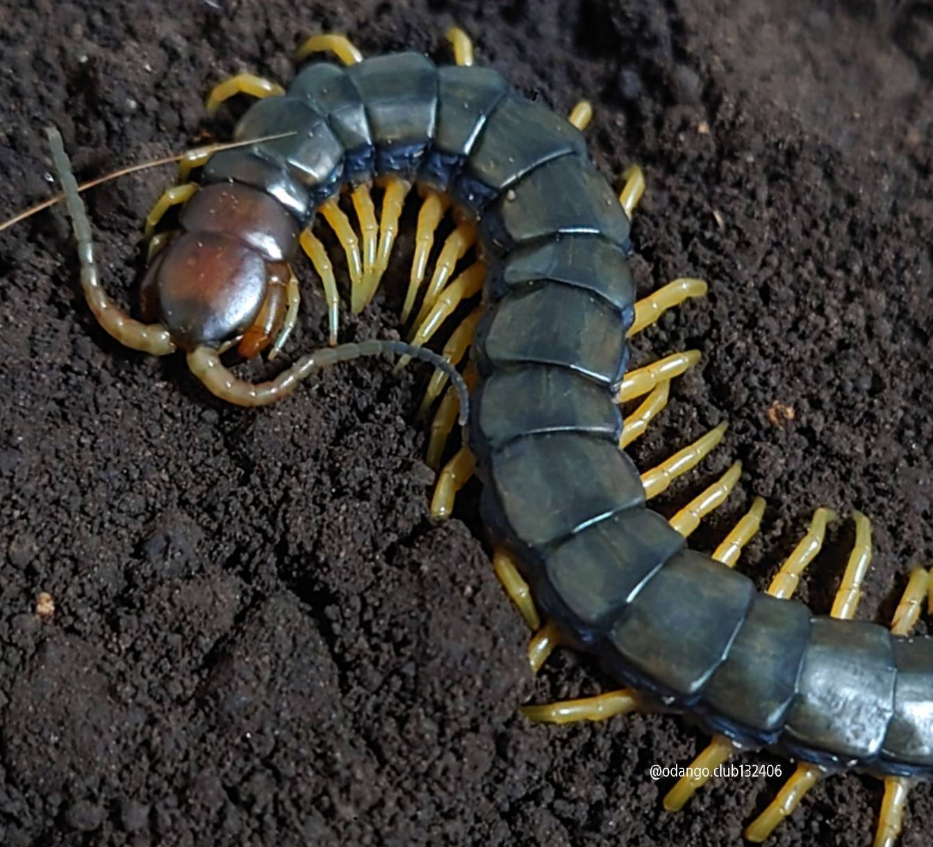 透け感のある黒みを帯びた緑色の体に綺麗なイエローレッグのムカデです。