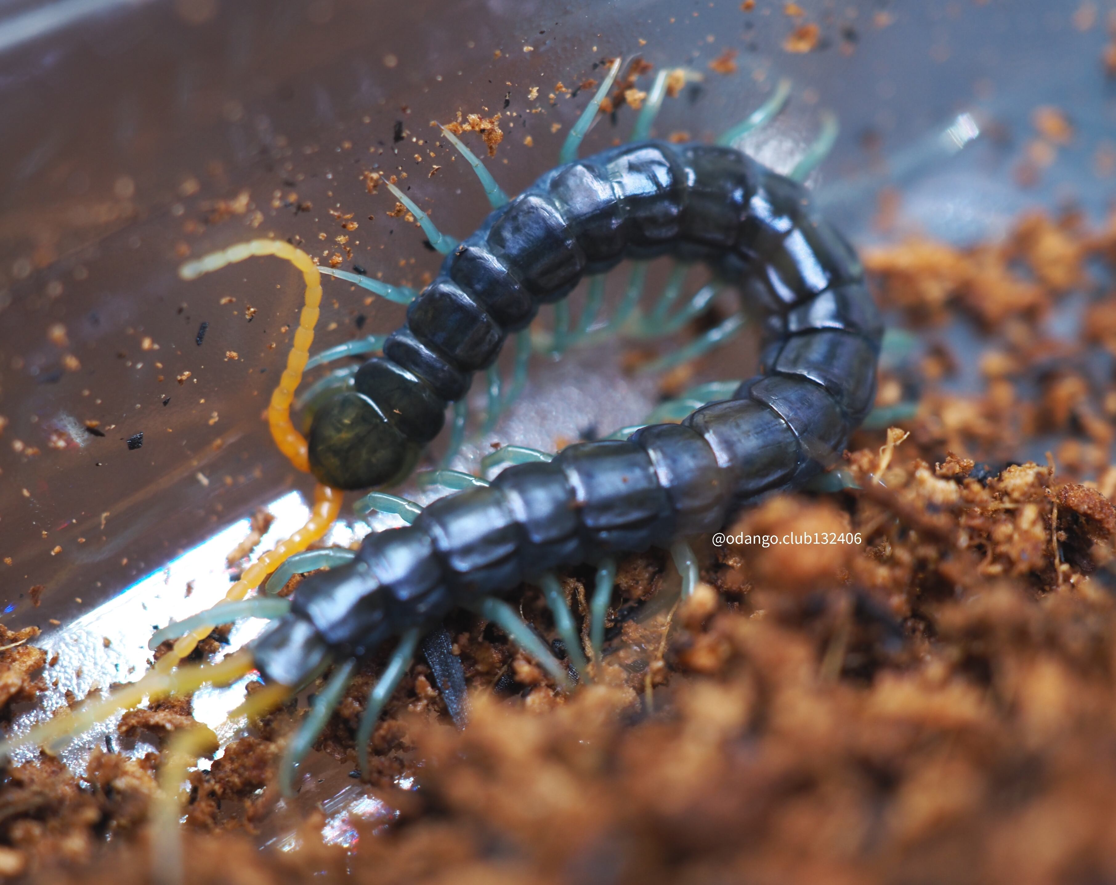 濃い青い体にオレンジの触覚と曳航肢が特徴的で、水色の脚も美しいムカデです。