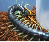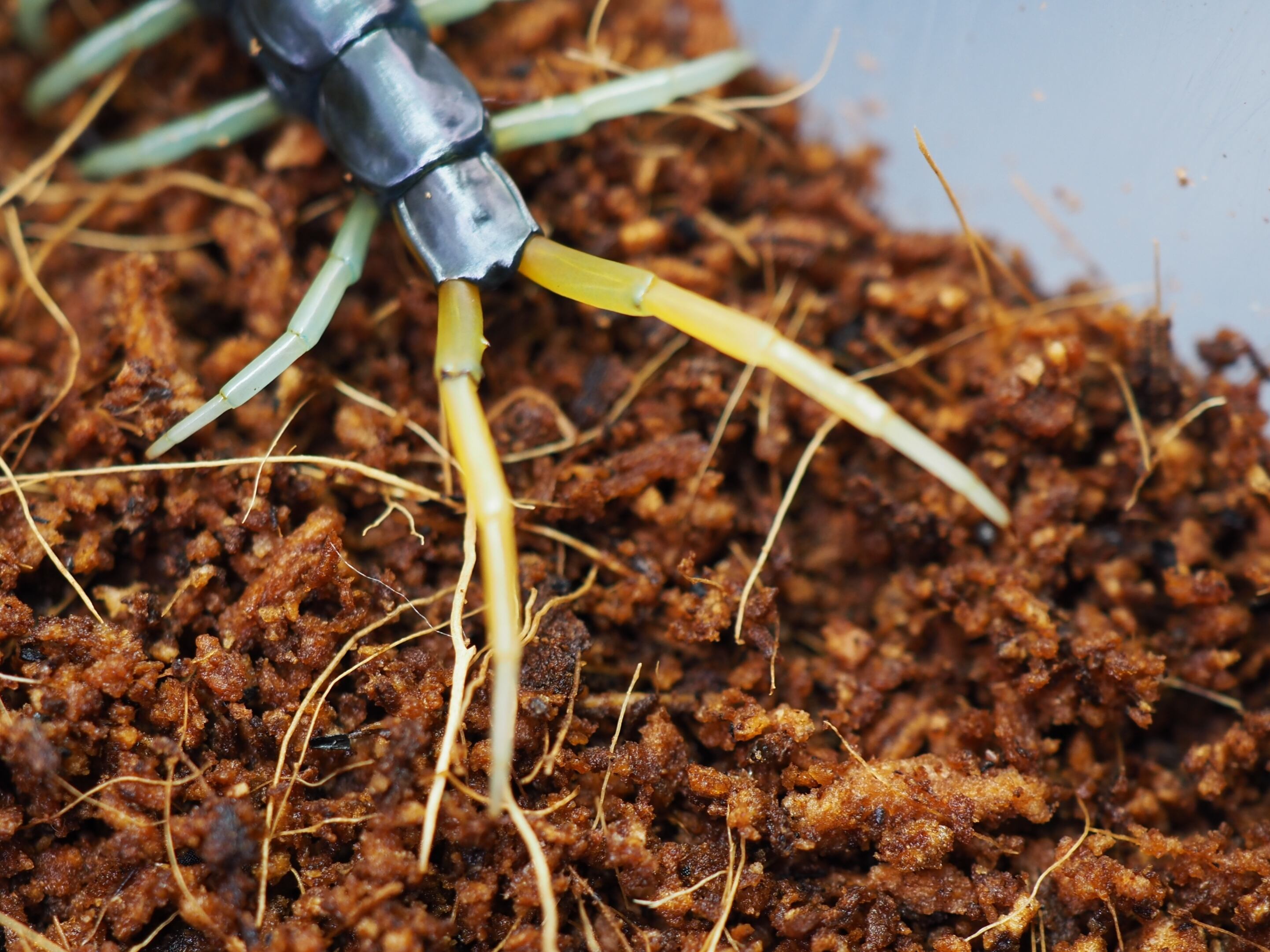 濃い青い体にオレンジの触覚と曳航肢が特徴的で、水色の脚も美しいムカデです。