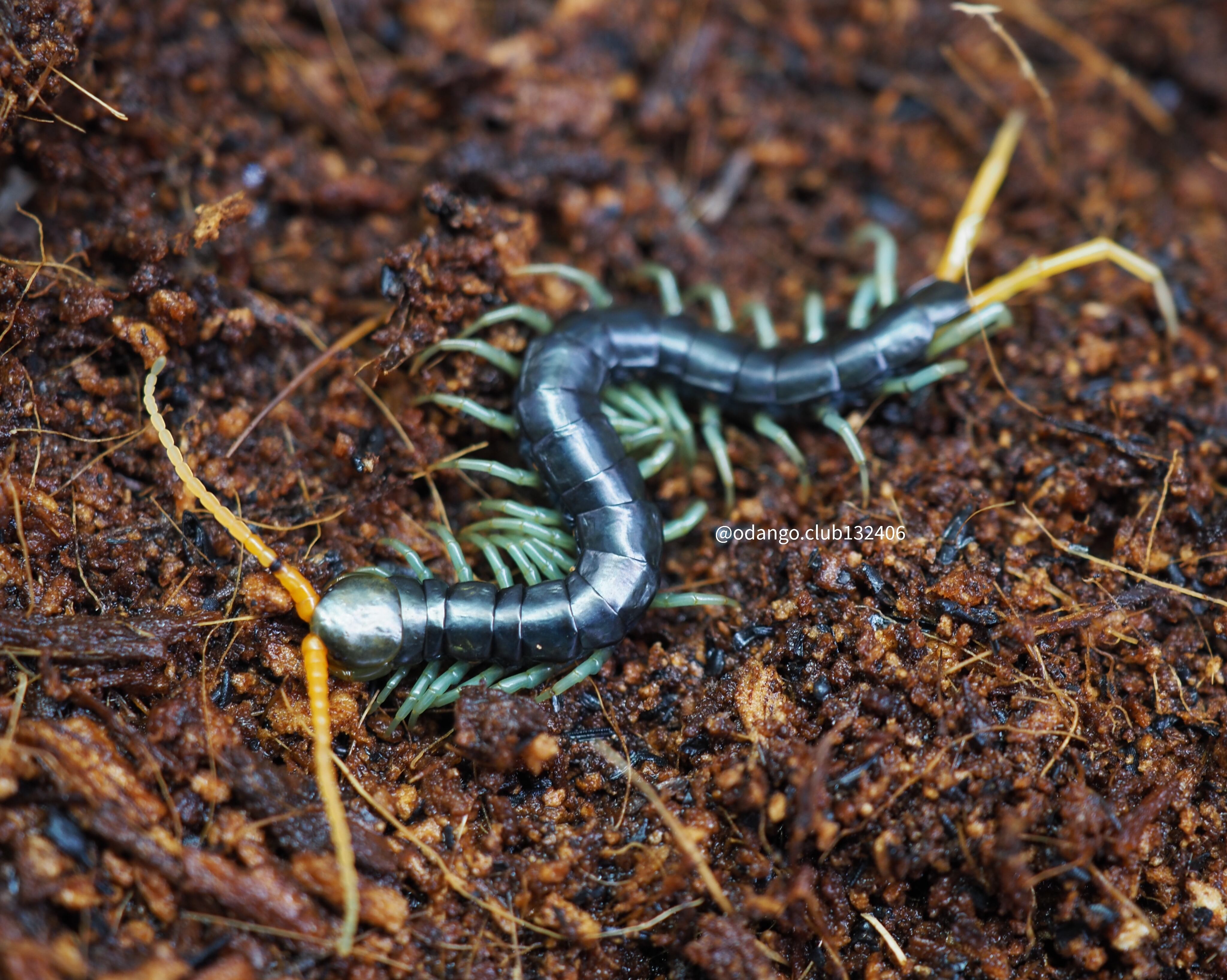 濃い青い体にオレンジの触覚と曳航肢が特徴的で、水色の脚も美しいムカデです。
