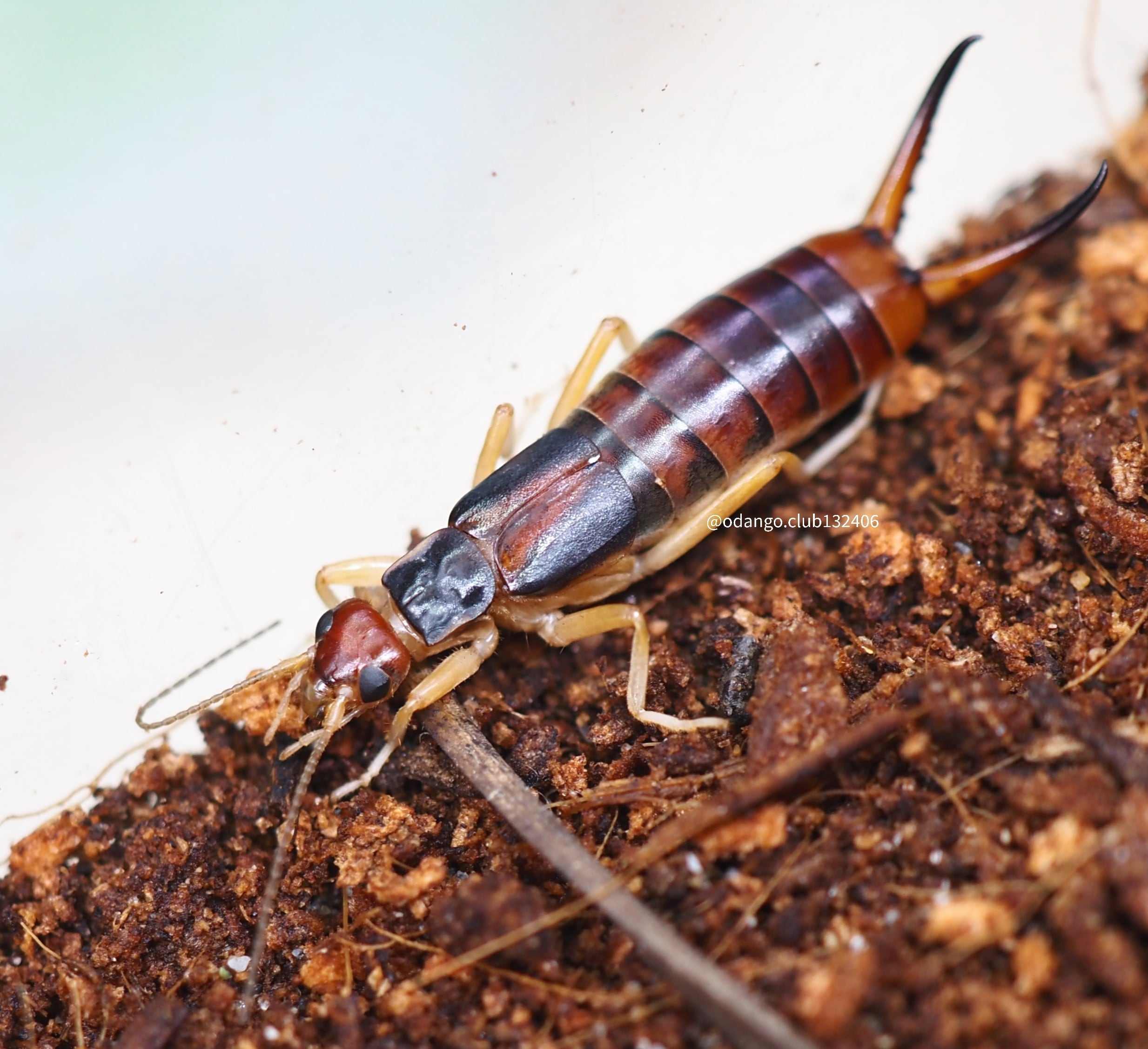 赤みを帯びた体に大きなハサミが特徴的なハサミムシです。