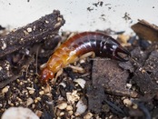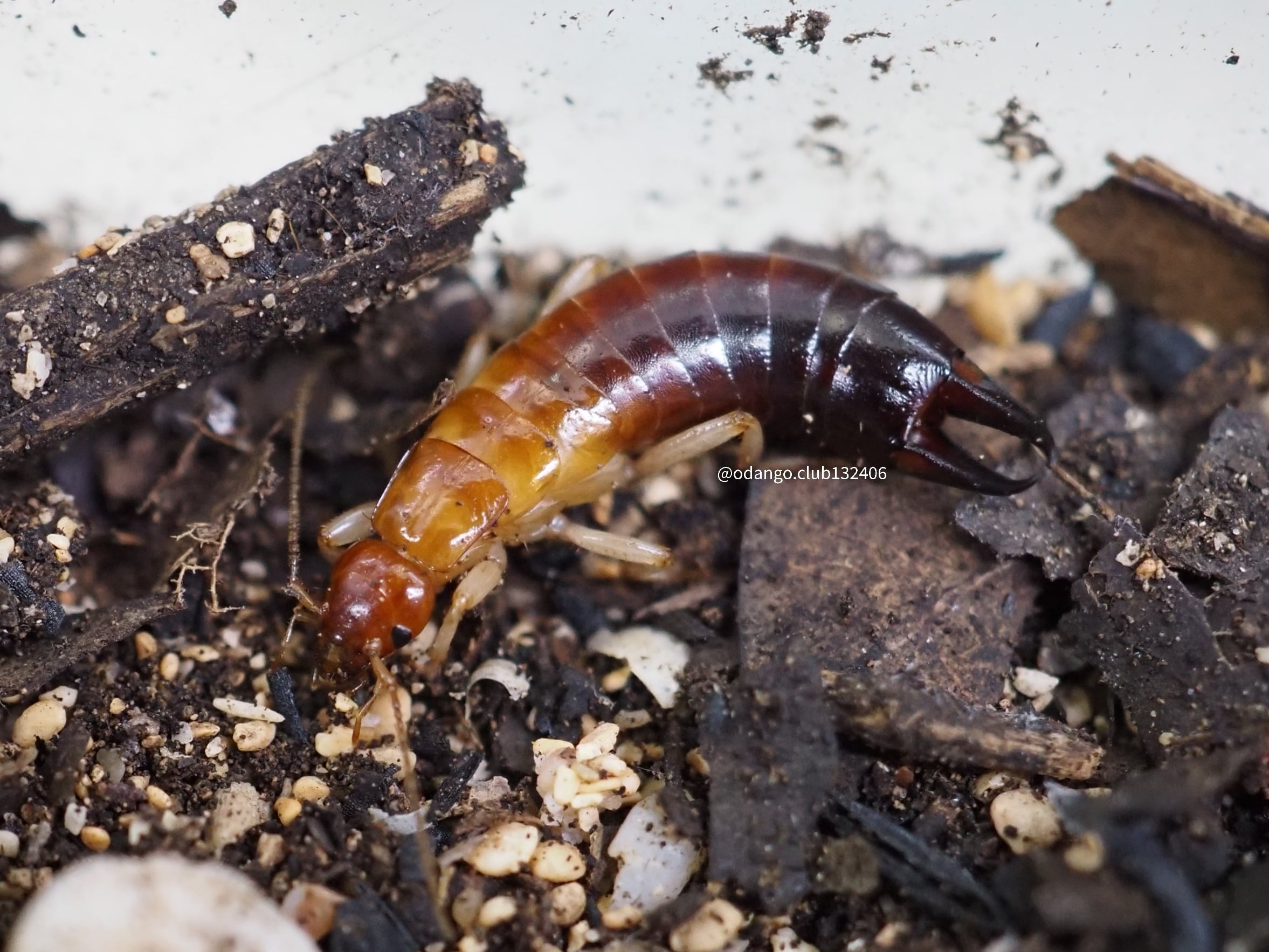 オレンジ色と赤みを帯びた黒色のツートンカラーのハサミムシです。