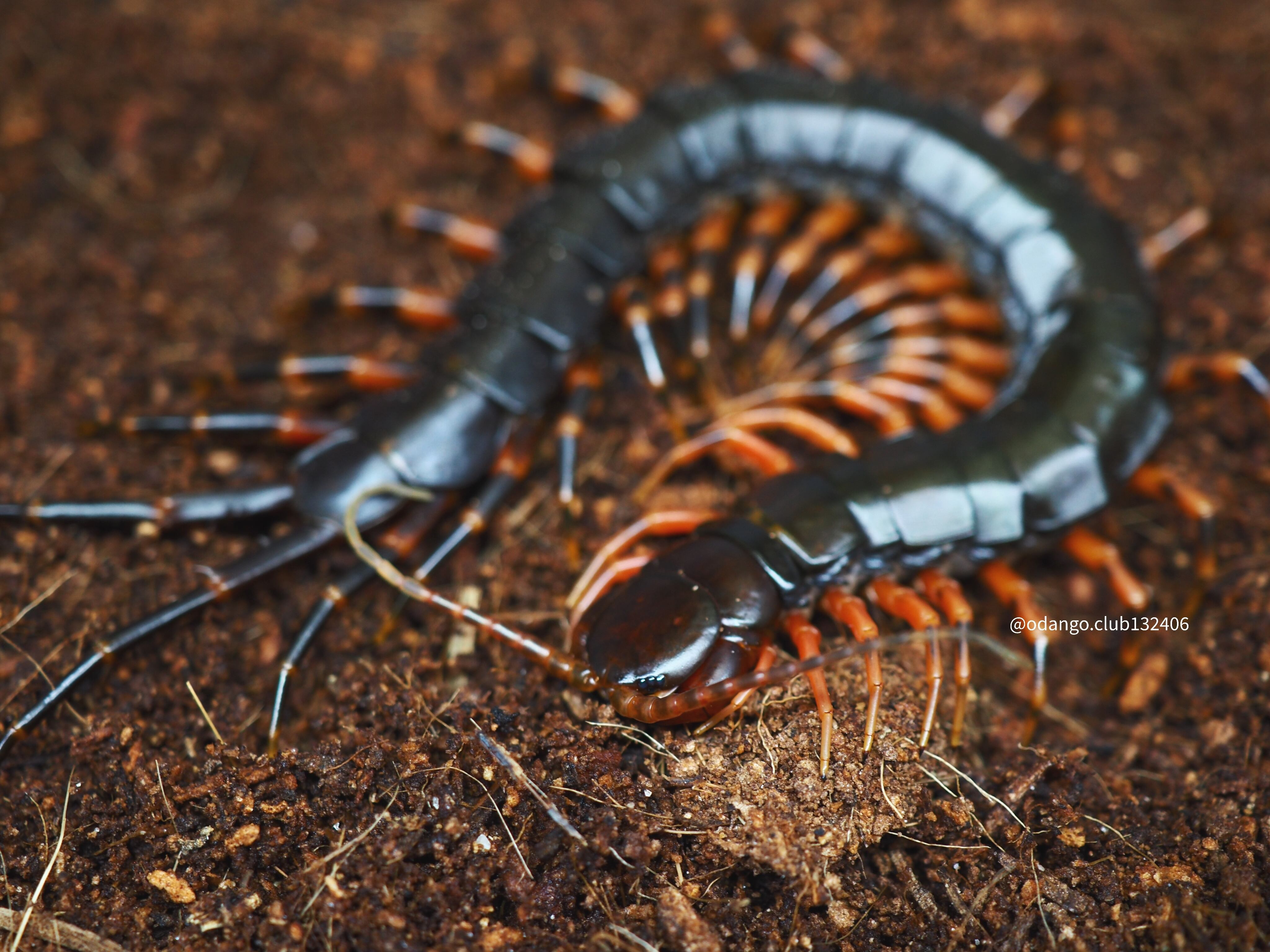 黒い体にオレンジレッグで脚に黒色のバンドが入る美しいムカデです。