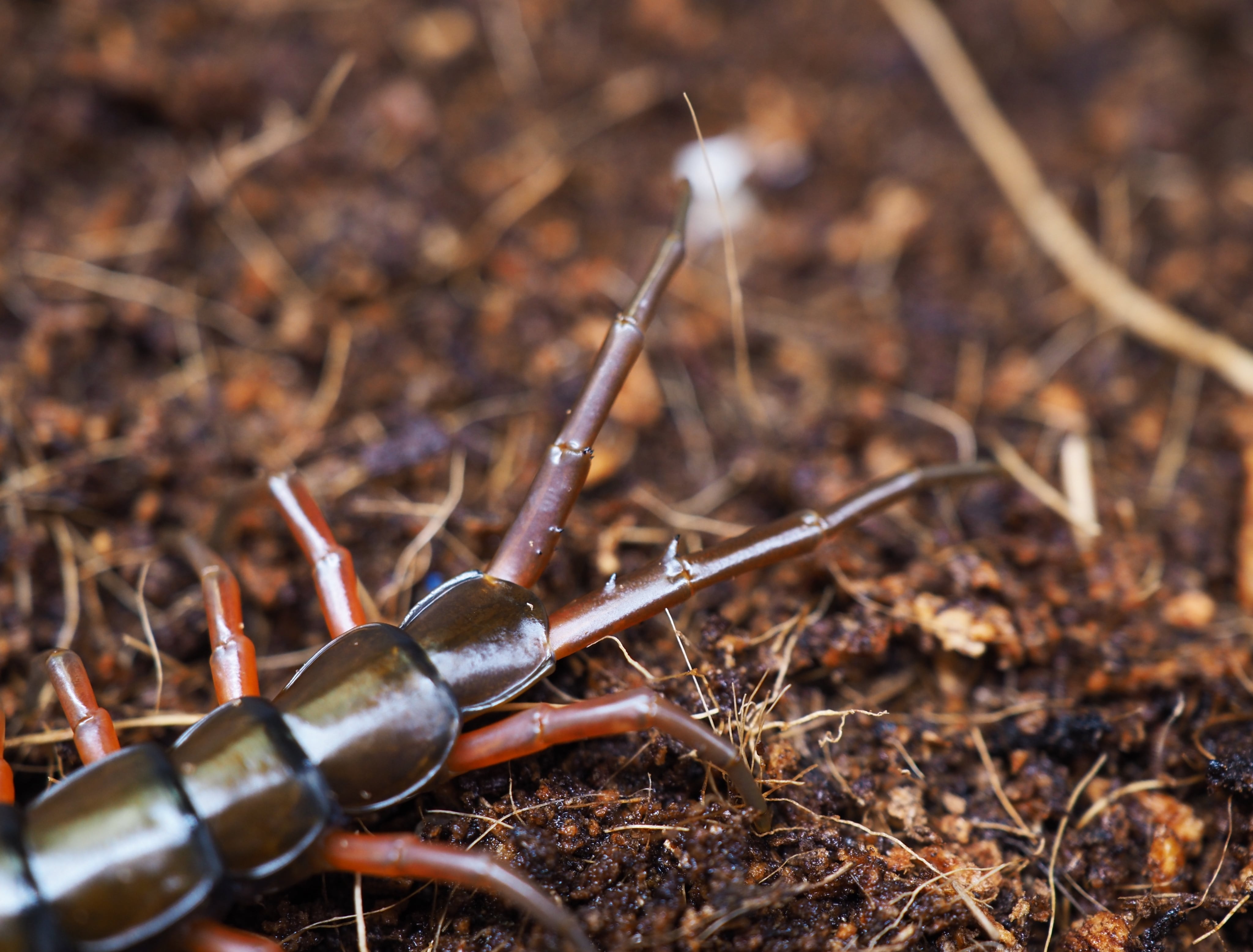 赤みを帯びた茶色の体に赤色の脚が美しいムカデです。