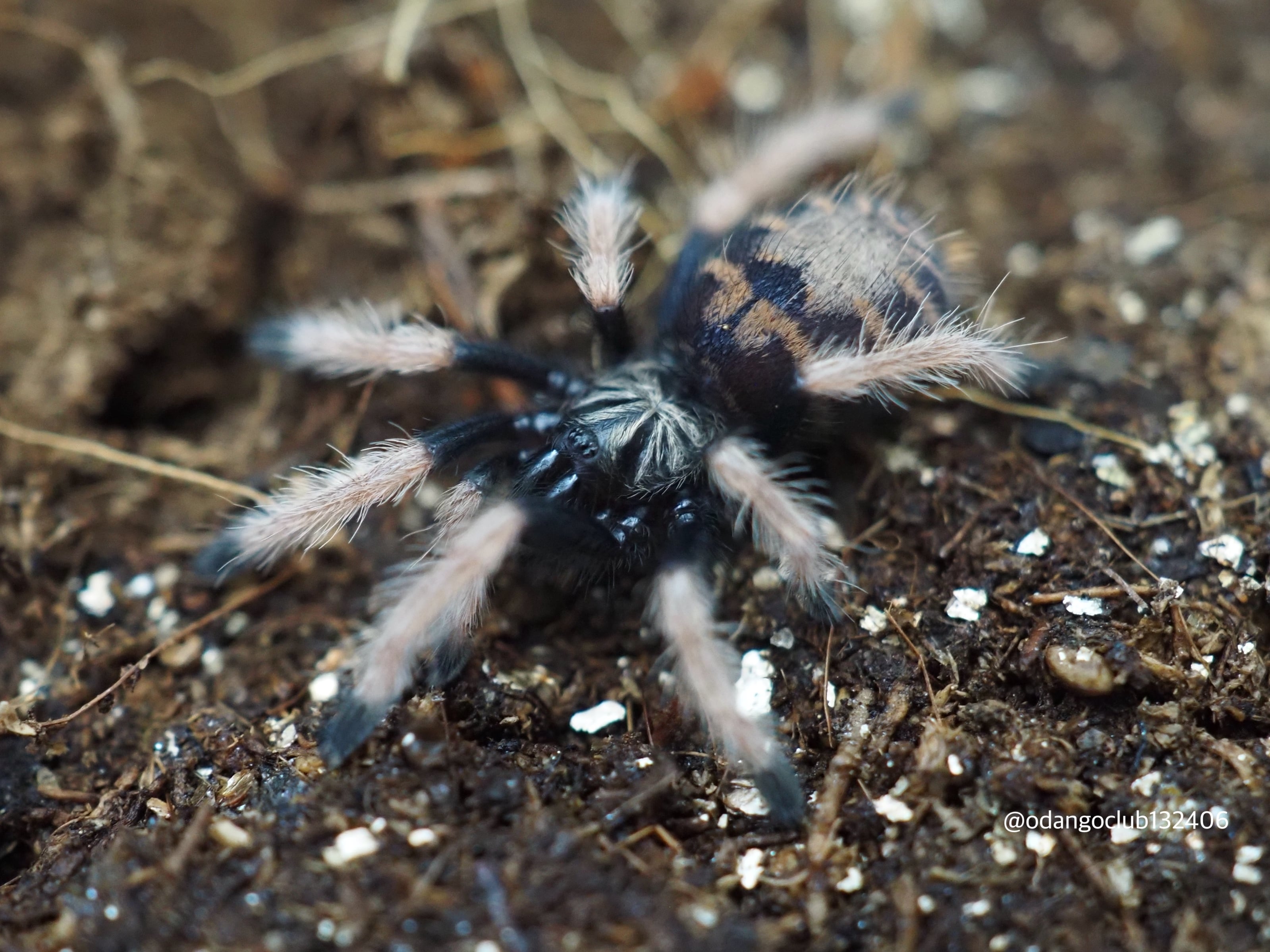 成長すると背甲が緑色、腹部がオレンジ色になり脚は青色という大変美しい蜘蛛になります。