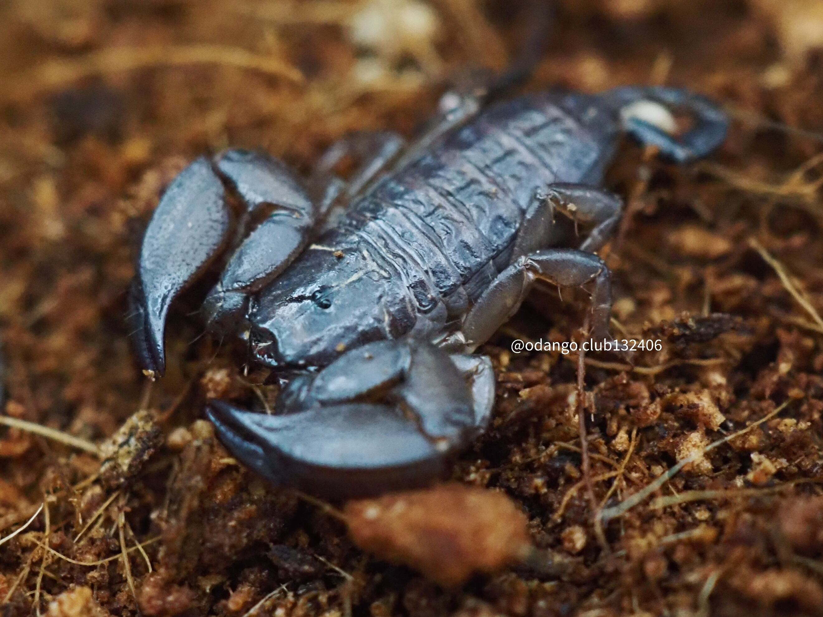 小型のサソリながらずんぐりとした体に大きなハサミを持っておりカッコ良いです。