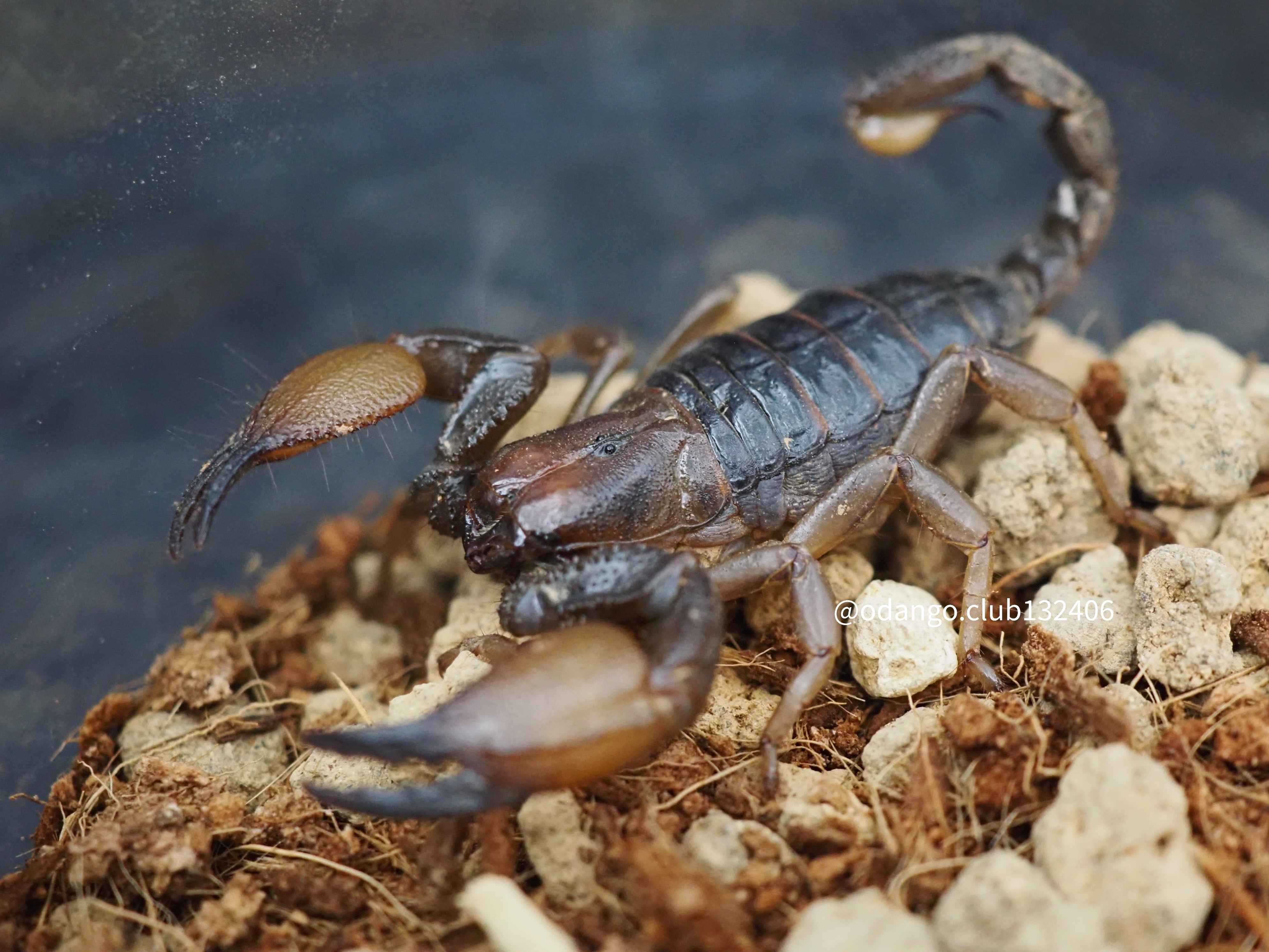 頭部と腹部で色が異なり、脚は薄い黄色の美しいサソリです。