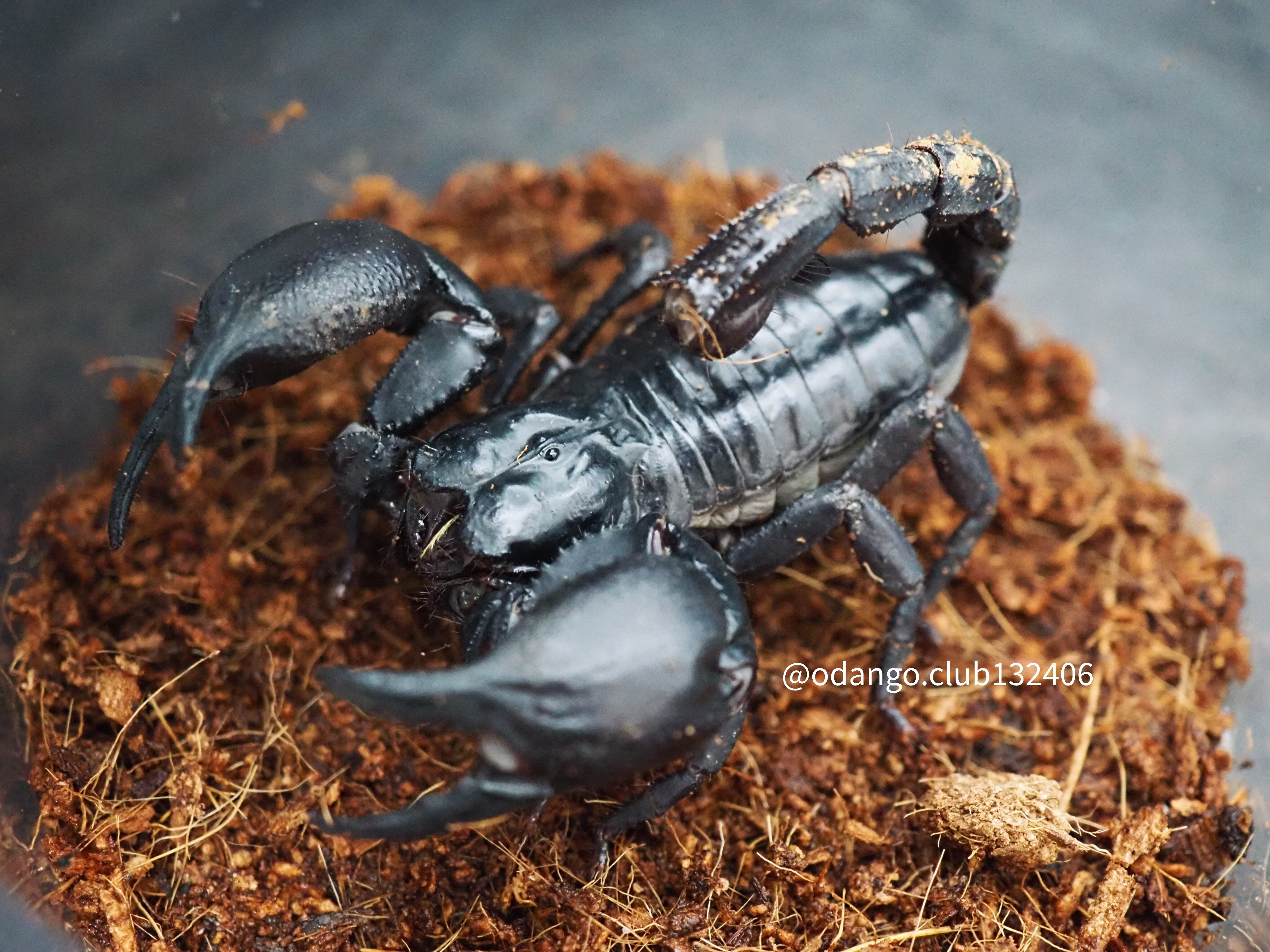 黒色の艶感の少ない体に大きな鋏が格好良いサソリです。