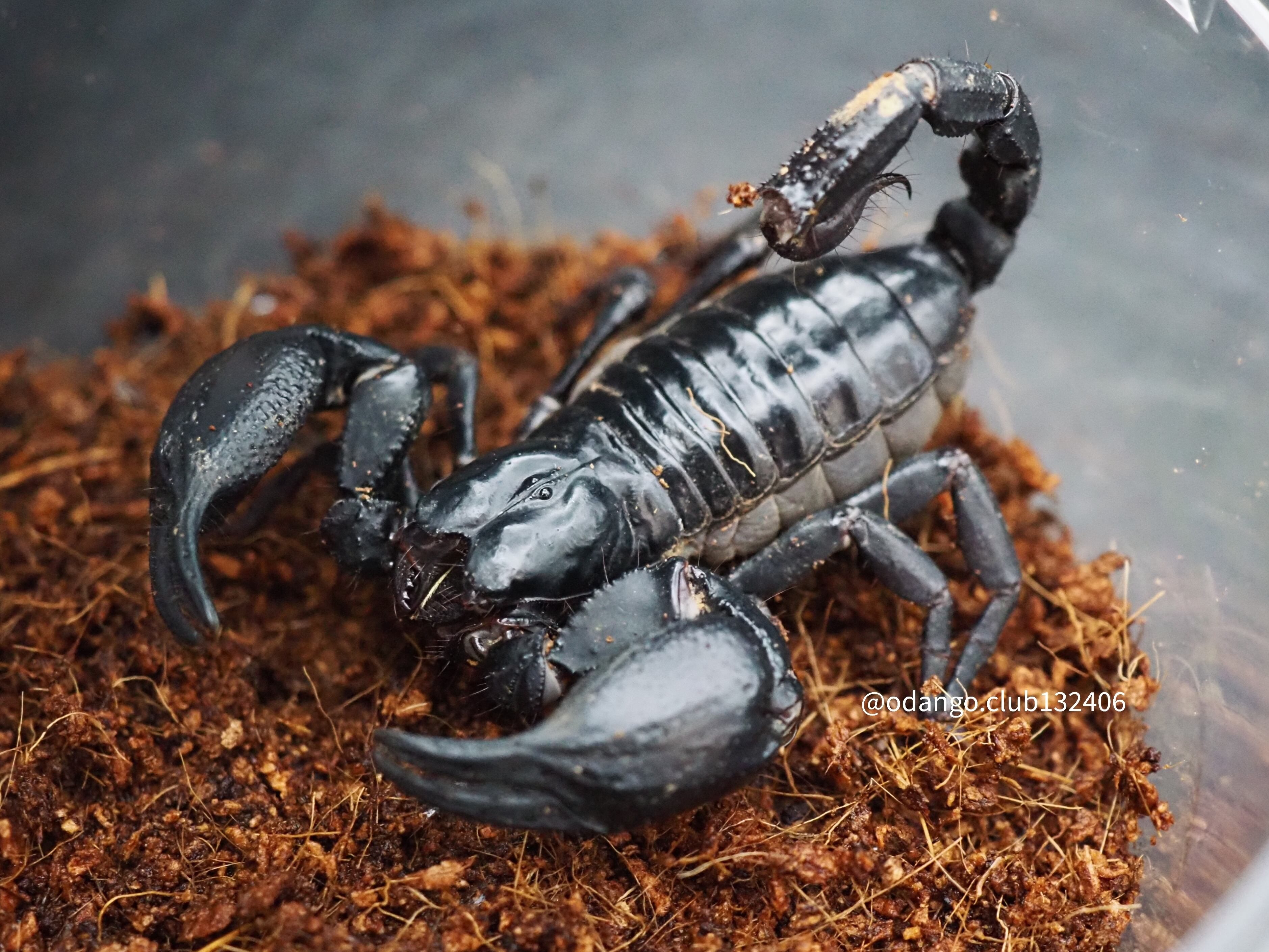 黒色の艶感の少ない体に大きな鋏が格好良いサソリです。