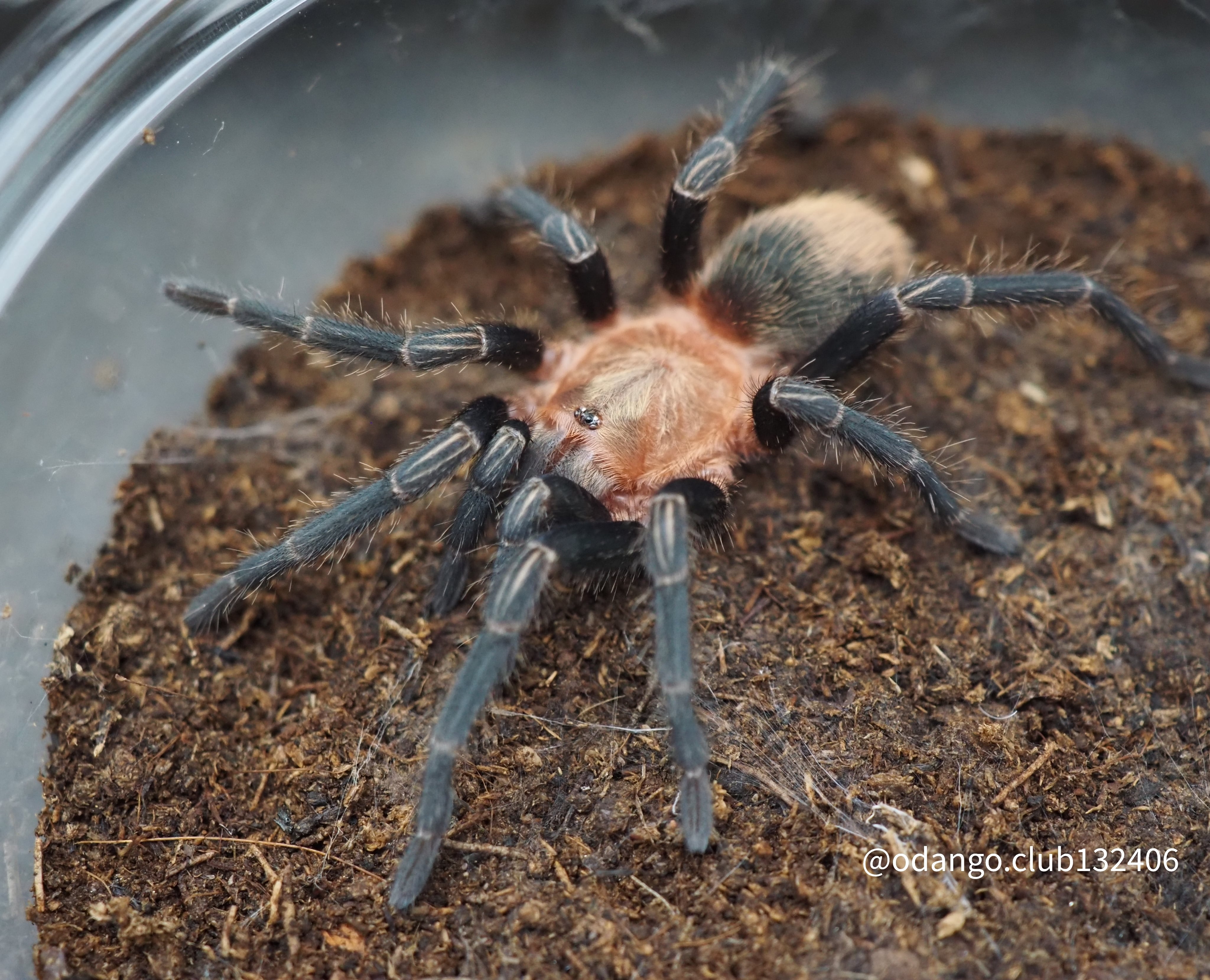 成長すると青紫色の脚に腹甲がオレンジ色の美しいタランチュラになります。
