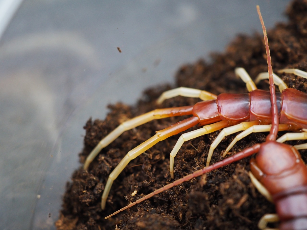 大人気の南米種で成長すると大きな体に独特なカラーリングの歩脚、根元と先端で色の異なる触覚が美しいムカデになります。