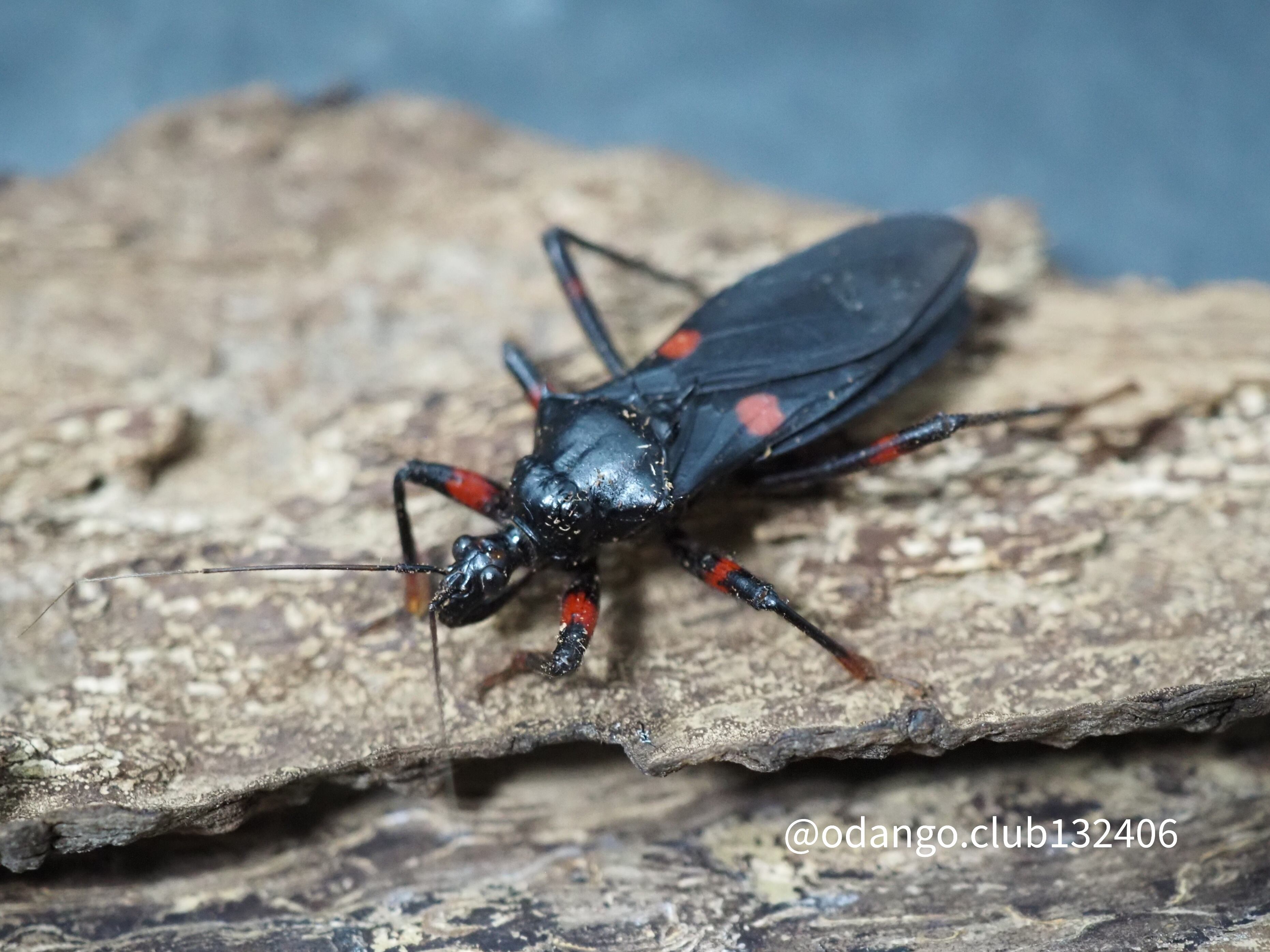 成長すると画像のような大きな黒い体に赤色のスポットが入る美しい肉食サシガメになります。