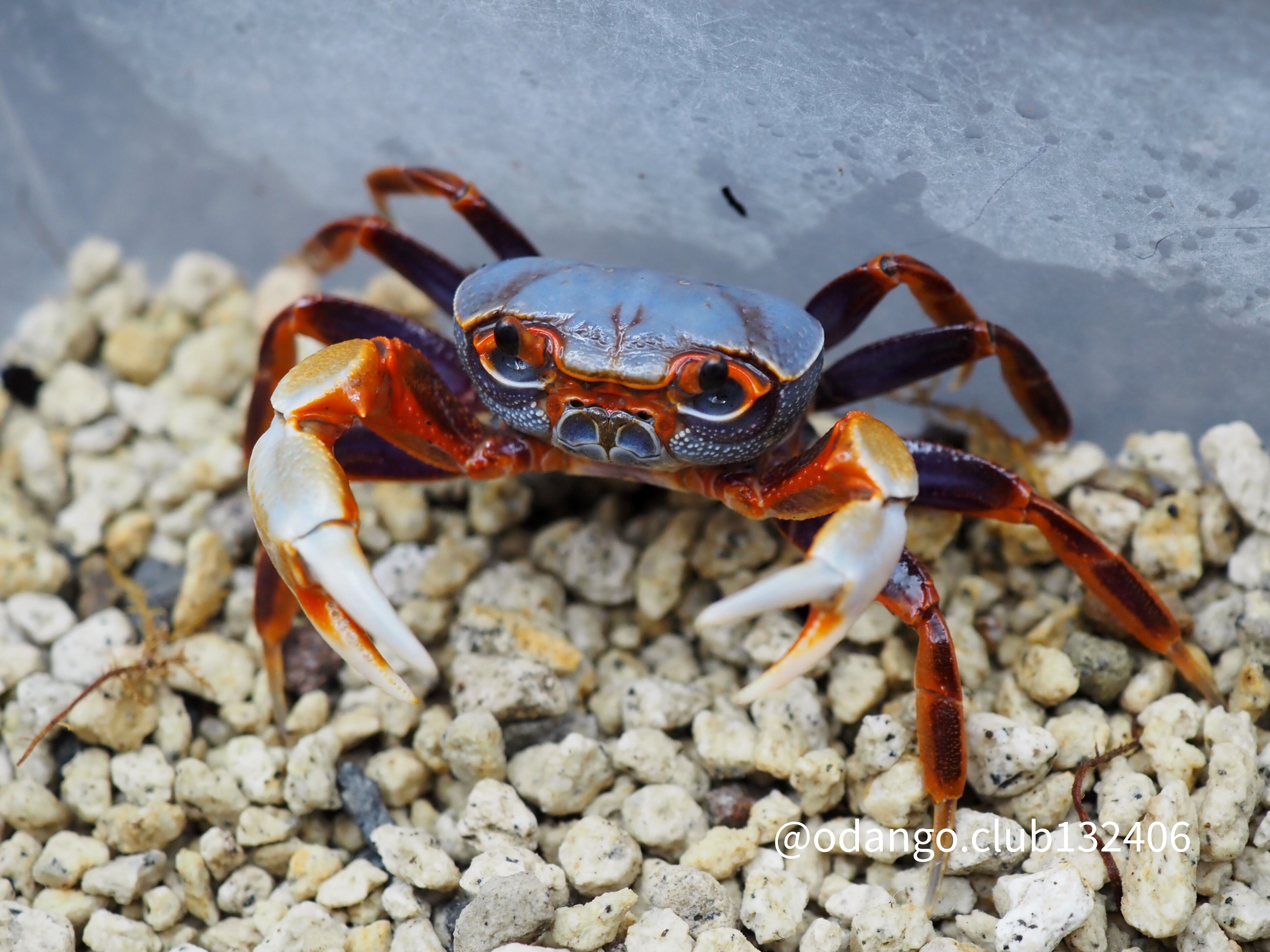 水色の甲羅にクリーム色の大きなハサミが特徴的なカニです。