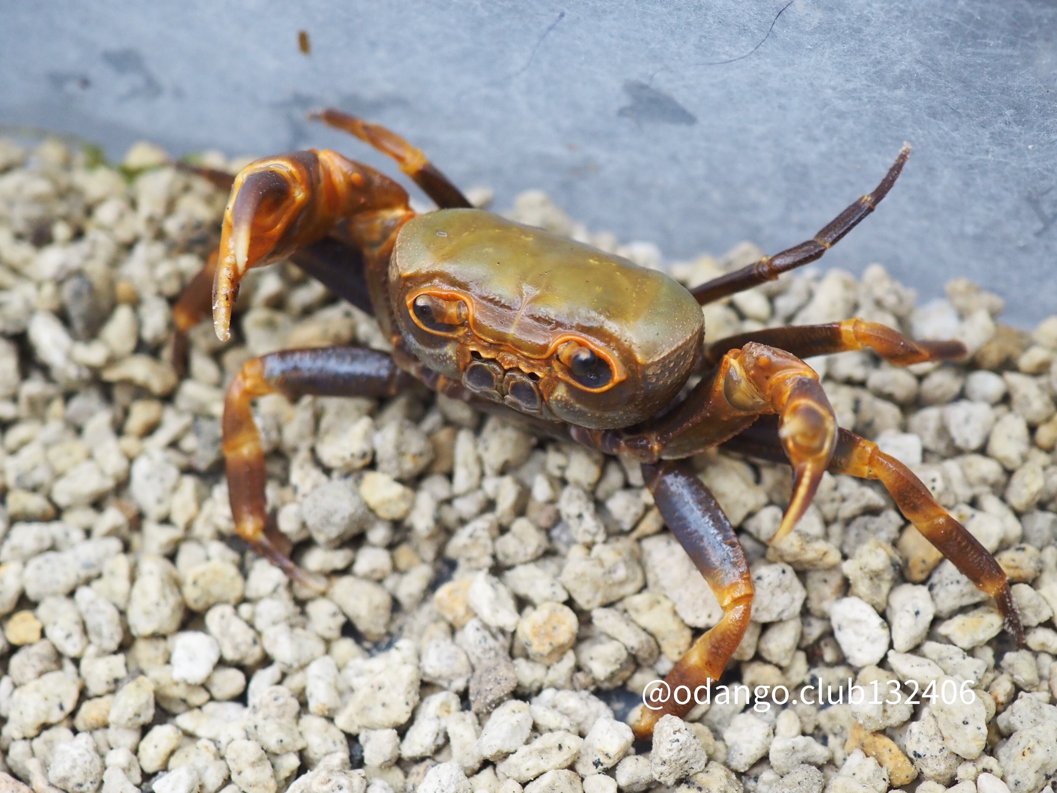 淡い緑色の甲羅にオレンジ色と紫色が交互に入る歩脚が美しいカニです。